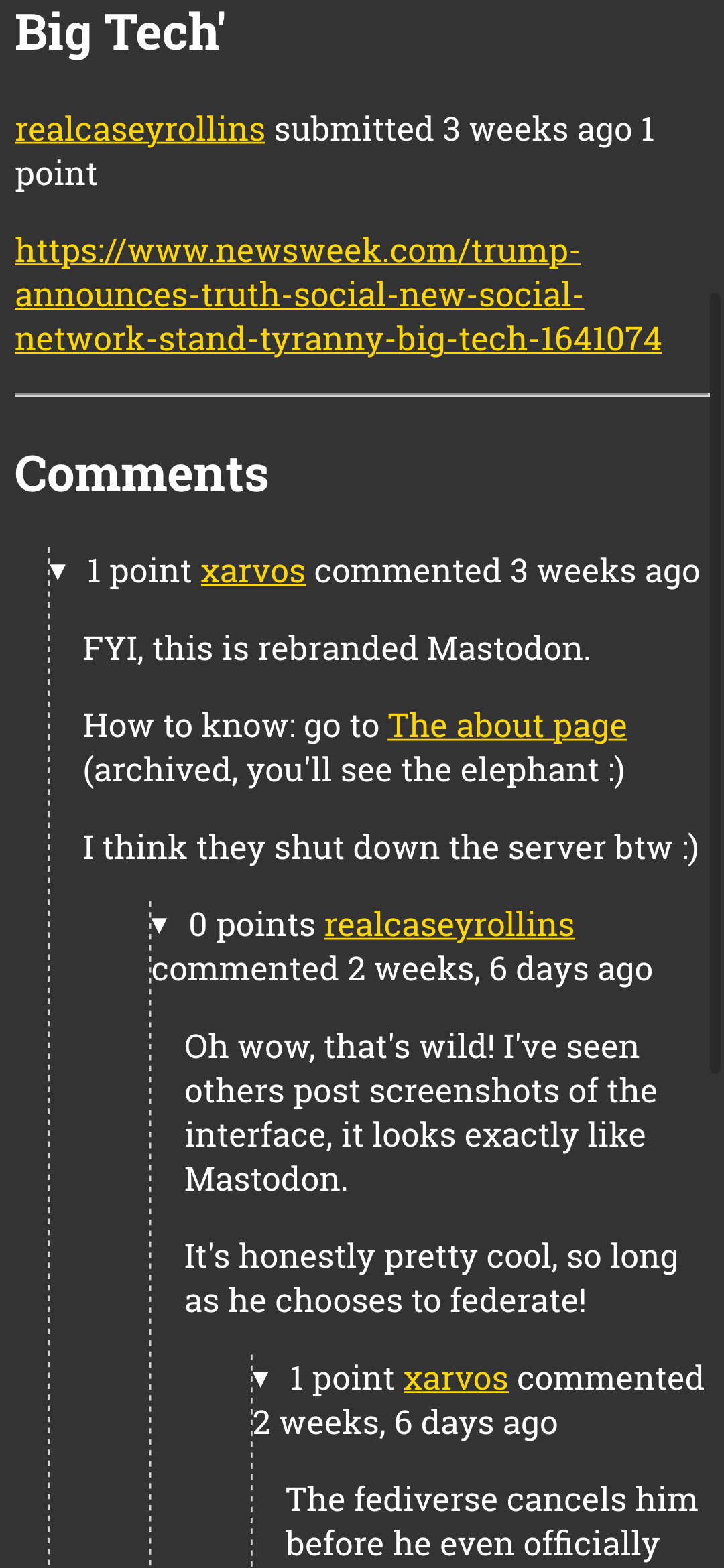 xarvos@narwhal.city 4 years agoHi, thanks for the response. I'll try to host an instance when I can afford and after I implement comment. Till then, here is a mobile screenshot.